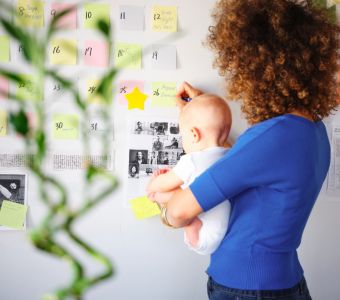 WS Ordentlicher Wiedereinstieg_Weiterbildung BerufsWege für Frauen e. V., Eine Frau mit Baby im Arm steht vor ihrer Terminplanung, es herrscht eine freundliche und positive Atmosühäre